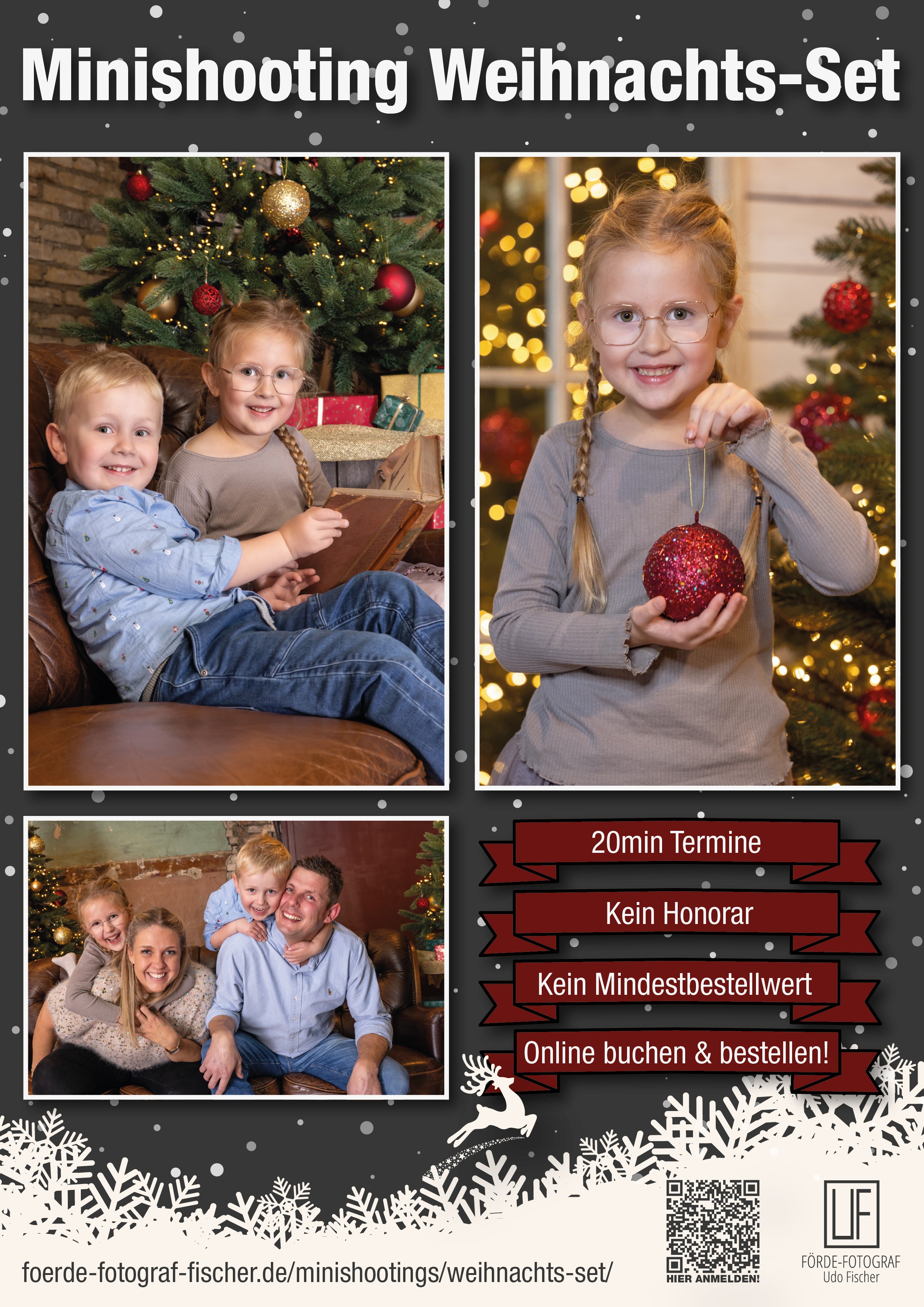 Neben dem extra aufgebauten Weihnachts-Set werden auch Bilder vor neutralerem Hintergrund gemacht. Der Fokus liegt auf Einzel-, Paar- und Familienbildern mit weihnachtlichem Charme zum Verschenken.